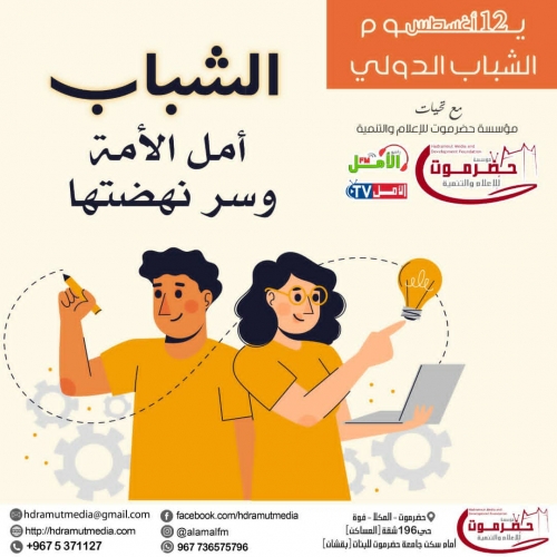 مؤسسة حضرموت للإعلام والتنمية تحيي فعالية توعوية أحيت مؤسسة حضرموت للإعلام والتنمية فعالية توعوية بمناسبة اليوم العالمي للشباب الذي يصادف الـ 12من أغ...