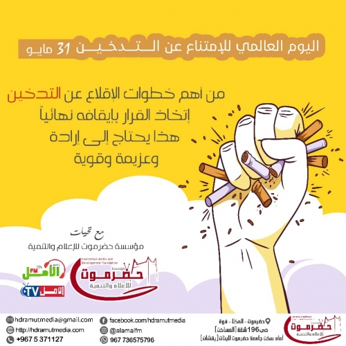 حضرموت للإعلام تنفذ حملة بمناسبة اليوم العالمي للامتناع عن التدخين نفذت مؤسسة حضرموت للإعلام والتنمية حملة توعوية بمناسبة اليوم العالمي للامتناع عن التدخين الذي يصادف...