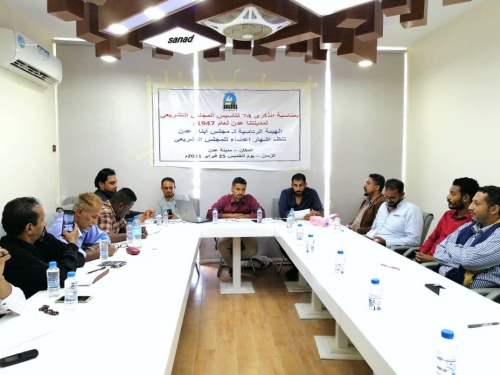 "انجلان" يلتقي بالهيئة الرئاسية لمجلس أبناء عدن التقى رئيس مجلس أبناء عدن ، مروان انجلان ، أمس " الخميس " ، بأعضاء الهيئة الرئاسية للمجلس ، وذلك لإح...