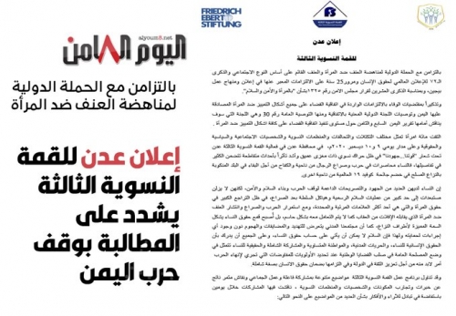 إعلان عدن للقمة النسوية الثالثة يشدد على المطالبة بوقف حرب اليمن شدد ما اطلق عليه اعلان عدن للقمة النسوية الثالثة، على المطالبة بوقف الحرب الدائرة في اليمن منذ ست سن...