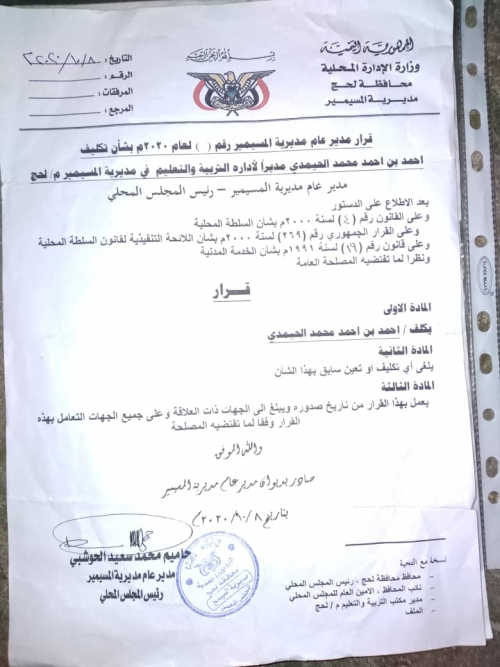 صدور قرار يقضي بتكليف "أحمد الحيمدي" مديراً لإدارة التربية والتعليم أصدر الشيخ "حاميم محمد سعيد الحوشبي" مدير عام مديرية المسيمير محافظة لحج اليوم قراراً إدارياً قضى بت...
