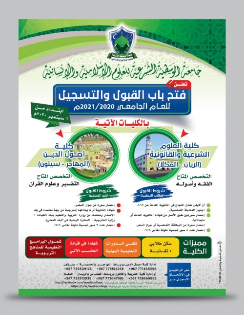 "الوسطية الشرعية" تعلن عن استمرار التسجيل والقبول للعام الجديد أعلنت نيابة شؤون الطلاب بجامعة الوسطية الشرعية للعلوم الإسلامية والإنسانية بشِعب الإمام المهاج...