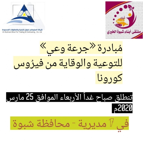 «أبناء شبوة الخيري» يطلق مُبادرة «جرعة وعي» للوقاية من كورونا يستعد ملتقى أبناء شبوة الخيري 1+3 برعاية وتمويل شركة السليماني إخوان للتجارة والمقاولات المحدودة ، ل...