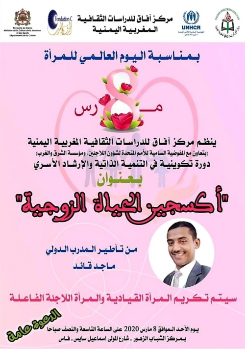"آفاق للدراسات الثقافية المغربية اليمنية" ينظم دورة أكسجين الحياة الزوجية نظم مركز آفاق للدراسات الثقافية المغربية اليمنية بالتعاون مع المفوضية السامية للأمم المتحدة لشؤون ال...