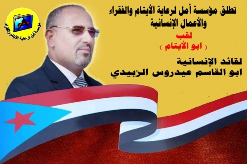 "أمل" تطلق لقب أبو الأيتام وقائد الإنسانية للقائد عيدروس الزبيدي أطلقت مؤسسة أمل لرعاية الأيتام والفقراء لقب أبو الأيتام على القائد عيدروس الزبيدي رئيس المجلس الإنتق...