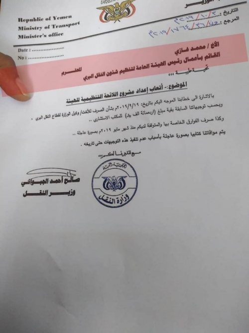 وزير النقل يجرد القائم بإعمال رئيس هيئة النقل من منصبه وجه وزير النقل صالح الجبواني بعدم التعامل مع القائم باعمال رئيس هيئة النقل البري علي محروق وتجريده م...