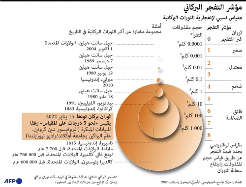 تقرير: "بركان جزر تونغا".. ينفث دخان على شكل فطر بلغ ارتفاعه 40 كلم تخطت قوة ثوران بركان جزر تونغا في 15 كانون الثاني/يناير قوة قنبلة هيروشيما النووية، بحسب م...