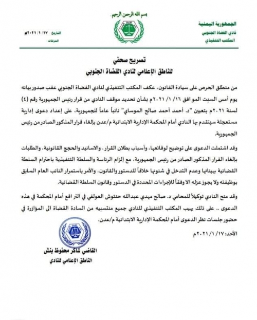 القضاة الجنوبي يعكف رفع دعوى إدارية مستعجلة لإلغاء قرار هادي في تصريح صحفي قال القاضي "شاكر محفوظ بنش" الناطق الاعلامي لنادي القضاة الجنوبي بأن المكتب التنفيذي ل...