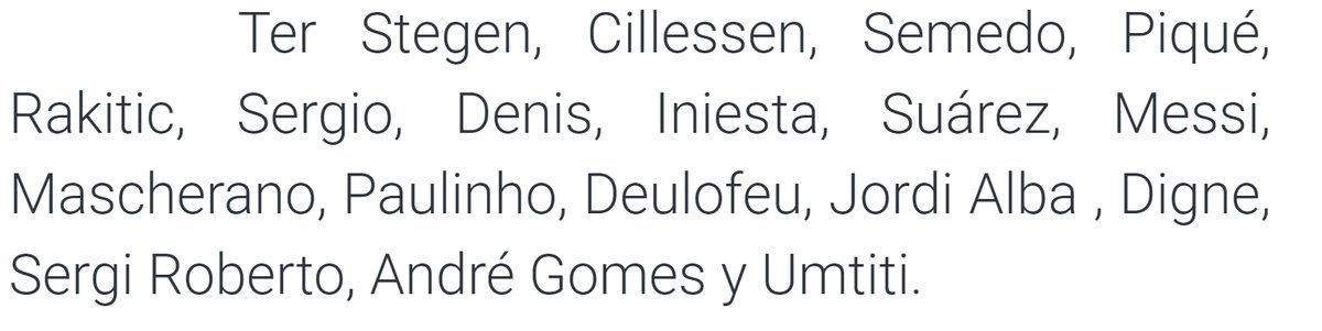 وضمت القائمة كلا من: "تير شتيجن، سيليسين، سيميدو، بيكيه، راكيتيتش، بوسكيتس، دينيس سواريز، انييستا، سواريز، ميسي، ماسكيرانو، باولينيو، ديولوفيو، جوردى البا، لوكاس دينيه، سيرجى روبيرتو، اندريه جوميز، أوميتيتى".