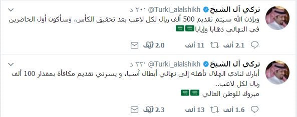 وكتب تركى آل الشيخ على صفحته الرسمية بموقع التواصل الاجتماعى "تويتر": "أبارك لنادي الهلال تأهله إلى نهائي أبطال آسيا، و يسرني تقديم مكافأة بمقدار 100 ألف ريال لكل لاعب".
