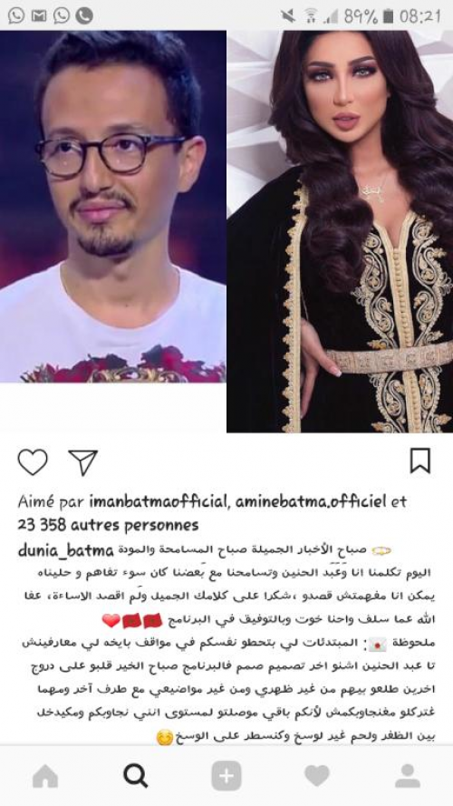 أعلنت الفنانة المغربية دنيا بطمة عن عقدها صلحاً مع نجم برنامج Project Runway مصمم الأزياء المغربي عبد الحنين رواح، وذلك عقب الرد العنيف الذي وجهته له بسبب وصفه لستايلها بالأوفر، مشيراً إلى أن رغبتها الكبيرة في الظهور بقفاطين مغربية أصيلة تفقدها تلك الأصالة.
