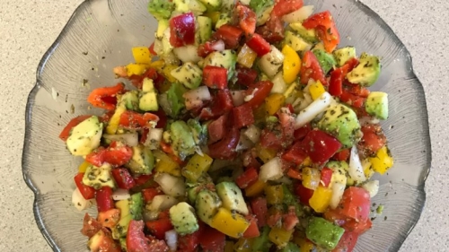 في وعاء متوسط، يجمع بين الأفوكادو والبصل والفلفل الطازج والطماطم والكزبرة وعصير الليمون، وتتبل السلطة بالملح والفلفل.