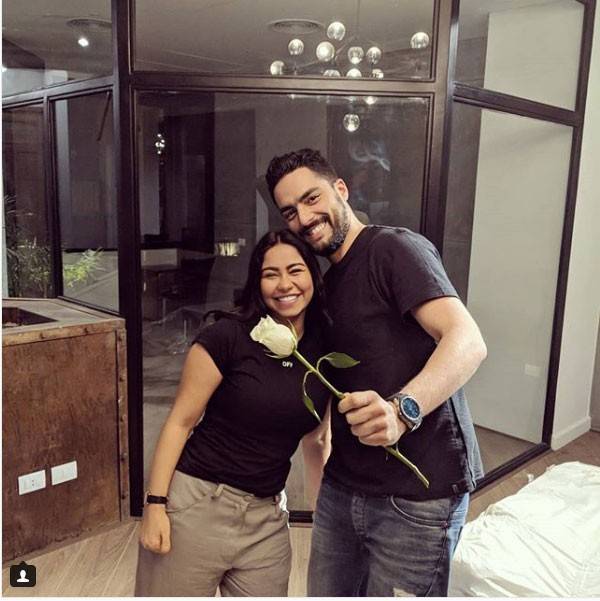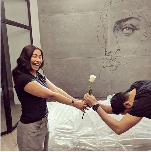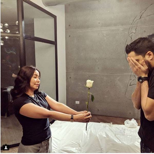 شيرين ظهرت في الصور وهي تهدي حسن وردة بيضاء، ويستقبلها منها حسن وهو منحني خجلا وتقديرا لها، بينما علقت قائلة: «أنا جايبالك وردة يا سونسون حسن قال لا لا لا طيب ينفع كده».