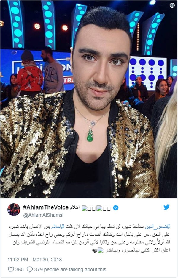 ومن جانبها، فتحت أحلام النار على شمس الدين، وأكدت أنها ستقاضيه، ونشرت صورة مسيئة له، على حسابها على "تويتر”، وقالت: ” #شمس_الدين ستأخذ شهره لن تحلم بها في حياتك لان قلت #احلام بس الانسان يأخذ شهره على الحق مش على باطل انت وقناتك أقسمت ماراح أتركم وحقي راح اخذه باْذن الله بفضل الله أولاً ولاني مظلومه وعلى حق وثانيا لأني أأومن بنزاهه القضاء التونسي الشريف ولن اعلق اكثر اكتفي بهالصوره وبهالقدر ".