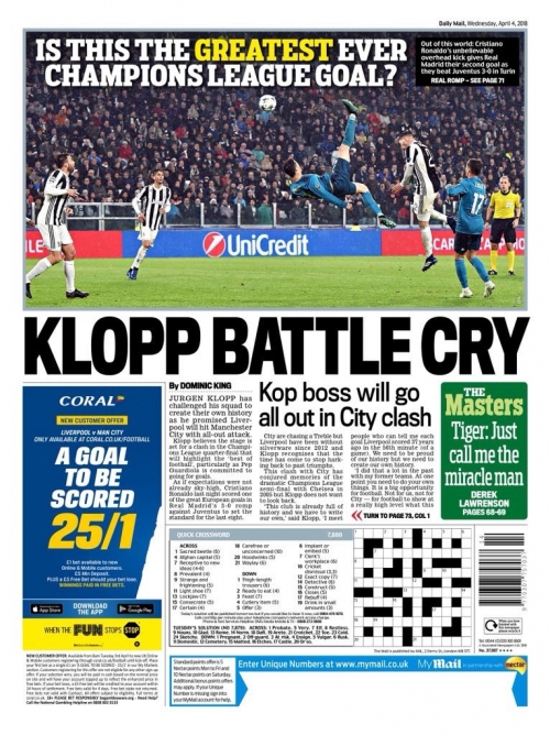 فى حين عنونت صحيفة "التايمز"، "كريستيانو رونالدو يزيح الستار عن الهدف الأعجوبة"، جدير بالذكر أن مباراة الإياب ستقام الأربعاء المقبل بملعب "سانتياجو برنابيو" معقل ريال مدريد.