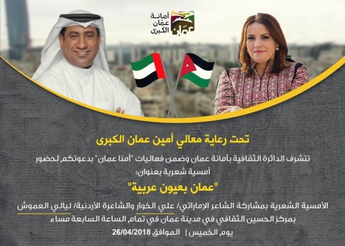تحت رعاية معالي أمين عمّان الكبرى الدكتور يوسف الشواربة، وضمن فعاليات " أمنا عمّان" تقيم الدائرة الثقافية في أمانة عمان الكبرى أمسية إماراتية أردنية بعنوان "عمان بعيون عربية" يشارك فيها ضيف الأردن شاعر الوطن الإماراتي علي الخوار والشاعرة الأردنية ليالي العموش مساء يوم الخميس الموافق 26-4-2018 في تمام الساعة السابعة مساء في مركز الحسين الثقافي.