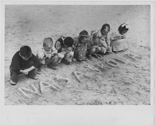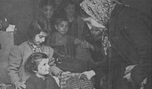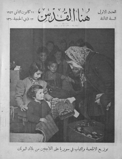 تُظهر الصورة امرأة ترتدي وشاحاً على رأسها، وأمامها صندوق يحتوي على بعض علب الأطعمة، وتمسك قطع ثياب بيديها لتوزعها على مجموعة من الأطفال المتحلقين حولها. كُتب أسفل الصورة "توزيع الأطعمة والثياب في سوريا على اللاجئين من بلاد اليونان"، وتأتي في سياق استقبال سوريا وبلدان عربية وشرق أوسطية أخرى آلاف اللاجئين الأوروبيين إبان الحرب العالمية الثانية التي عصفت بالقارة العجوز بين العامين 1939 و1945، حيث كانت مجلة "هنا القدس" التي تصدر في فلسطين آنذاك بشكل نصف شهري تهتم بشكل خاص بأخبار تلك الحرب.