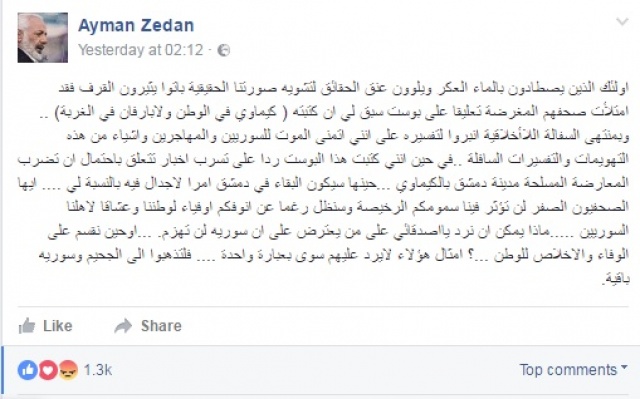 أشعل الممثل السوري أيمن زيدان مواقع التواصل الاجتماعي، بمنشوره الأخير على "فايسبوك".