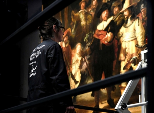 باشر متحف ريكسميوزيوم في أمستردام، الاثنين، أكبر عملية ترميم للوحة “دورية الليل” لرامبرانت خلف الواجهة الزجاجية في صالة الشرف في هذا الصرح، أمام أعين الزوار.