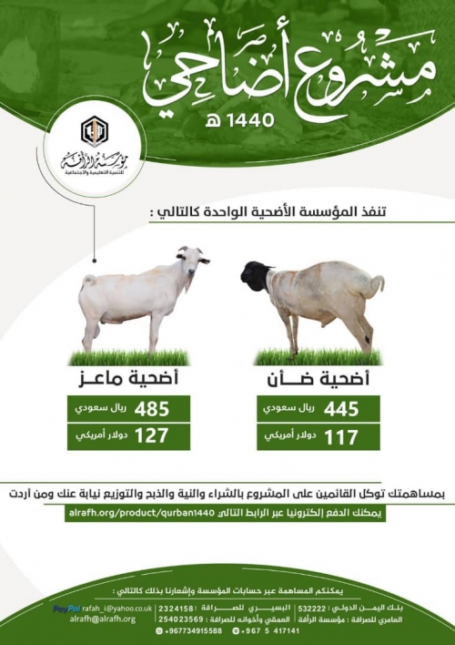 مواصلة للمشاريع السنوية الموسمية.. وتسهيلاً على إخواننا المحسنين.. بدأت مؤسسة الرأفة بتريم في استقبال المساهمات في مشروع أضاحي – 1440 هـ .يأتي ذلك من باب التعظيم لشعائر الله ومساعدة في القيام بها .. حيث تتولى المؤسسة شراء الأضاحي ونيتها وذبحها وتوزيعها على المستحقين وفق تعاليم الشرع الحنيف بعد توكيل المضحي لهم في ذلك ..