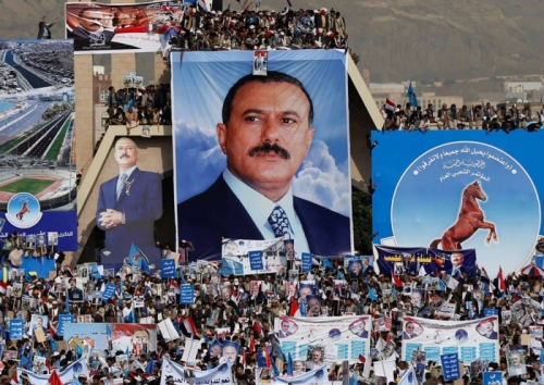 متظاهرون من حزب المؤتمر يرفعون صور زعيم الحزب الذي قتله الحوثيون أواخر 2017م - ارشيف