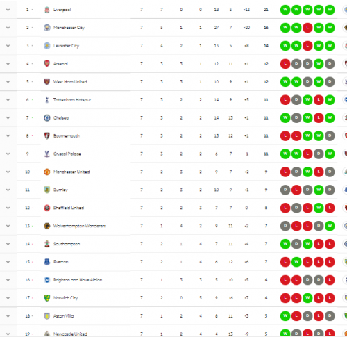 ويحتل ليفربول صدارة ترتيب الدوري الإنجليزي برصيد 21 نقطة، إذ أنه الفريق الوحيد الذى حقق الفوز في جميع المباريات السبع حتى الآن.