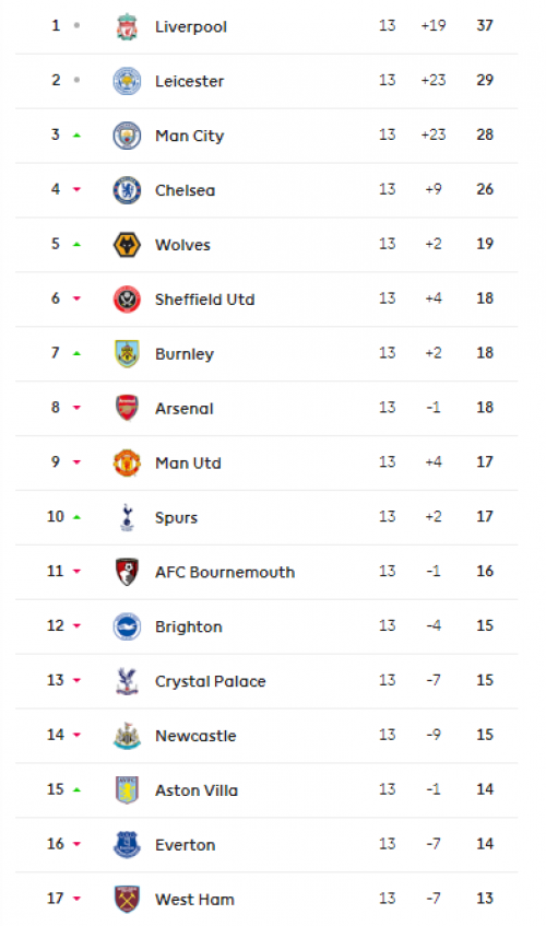ترتيب الدوري الانجليزي بعد نهاية الجولة الـ13