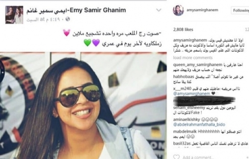 ونشرت إيمي صورة من حساب مزيف، يزعم إنها تنتمي إلى نادي الزمالك، وعلقت على الصورة قائلة: "أولا أنا معنديش فيسبوك، ثانيا ماليش في الكورة أساسا، والأكاونت ده مزيف، وكل الأكاونتات اللي على فيسبوك باسمي مزيفة... شكرا" .