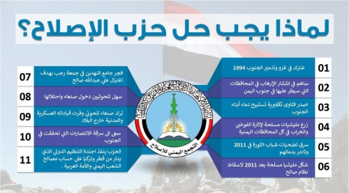 ارتباط بالإرهاب .. وتصعيد عسكري وسياسي وإعلامي لتعطيل العملية السياسية بما فيها اتفاق الرياض .. عداء للتحالف العربي .. دعم الفوضى والانفلات الأمني.. رعاية مشاريع التخريب والعبث .. تلفيق تقارير حقوقية .. شن حملات إعلامية .. استخدام جمعيات خيرية لتمويل الإرهاب ... كل هذه وغيرها من التحركات والمواقف التي ينتهجها حزب الإصلاح (أخوان اليمن)، وقبل ذلك التبعية لتنظيم الإخوان العالمي، وتنفيذ أجندات تحالف قطر وتركيا وإيران .. كلها مجتمعة باتت كفيلة لحظر نشاط الحزب، وحله باعتباره يستهدف الداخل ككل ويعادي التحالف وجهوده، بل ويستهدف أمن واستقرار المنطقة العربية.