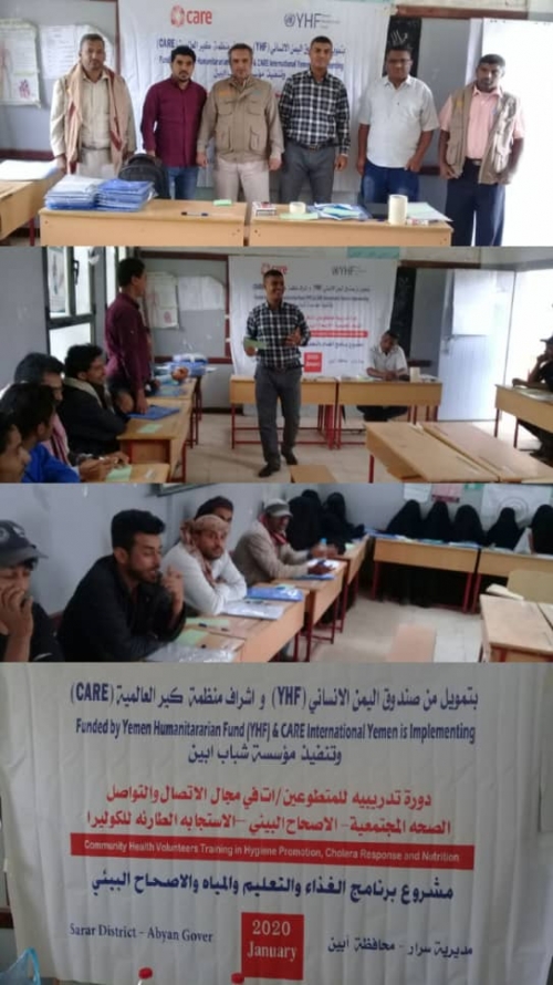 بتمويل من صندوق اليمن الإنساني (YHF) وتحت اشراف منظمة Care العالمية ، دشنت مؤسسة شباب أبين صباح امس الإثنين ، دورة تدريبية للمتطوعين والمتطوعات في مجال الاتصال والتواصل والصحة المجتمعية والاصحاح البيئي والاستجابة الطارئة للكوليرا بمديرية سرار يافع بمحافظة أبين .