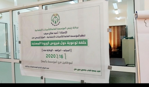 نظمت المؤسسة العامة لتأمينات الاجتماعية المركز الرئيسي بالعاصمة عدن ،اليوم ،حلقة توعوية حول فيروس كورونا المستجد، لموظفي المؤسسة بالمركز وفرعه بالمعلا ،بالتنسيق مع جمعية شباب جامعيين بدون عمل.