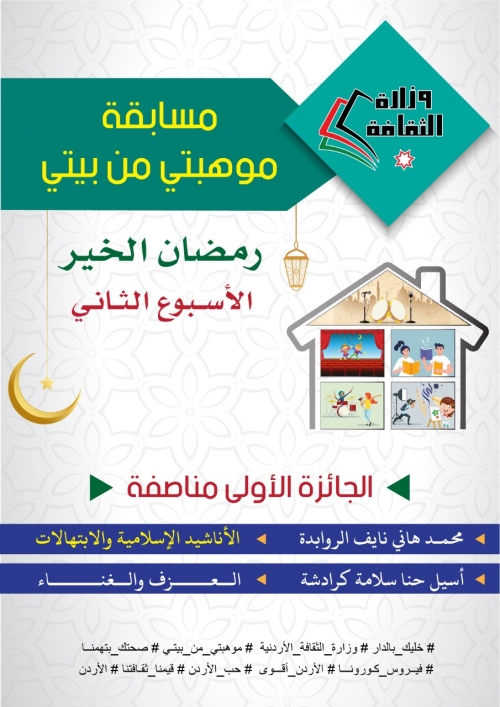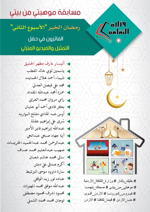 أعلنت وزارة الثقافة اليوم الأحد أسماء الفائزين في مسابقة "موهبتي من بيتي" في أسبوعها الخامس، حيث فاز بالجائزة الأولى لهذا الأسبوع محمد هاني نايف الروابدة عن حقل الإنشاد، مناصفة مع أسيل حنا سلامة كرادشة عن حقل الموسيقى.