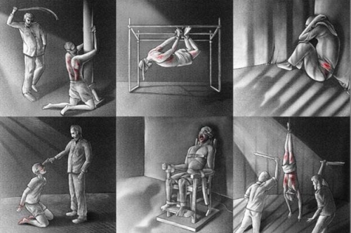 وقال أحد الضحايا من محافظة طهران تعرض للتعليق من يديه ورجليه بطريقة مؤلمة في عمود، وكان المحققون يشيرون إليها بأنها "كباب الدجاج"، لمنظمة العفو الدولية: " كان الألم مبرحاً. وكان الضغط والألم في جسدي شديدين لدرجة أنني كنت أتبوّل على نفسي."...عائلتي تعلم عن تعذيبي، ولكنها لا تعلم كيف عُذِّبت. أشعر بالاختناق من شدة البكاء لأنه لا يوجد أحد هنا يمكن التحدث إليه".