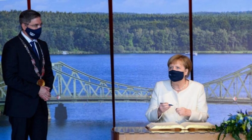 ميركل توقع في الكتاب الذهبي لمدينة بوتسدام خلال الاحتفالات بذكرى 30 سنة على الوحدة الألمانية