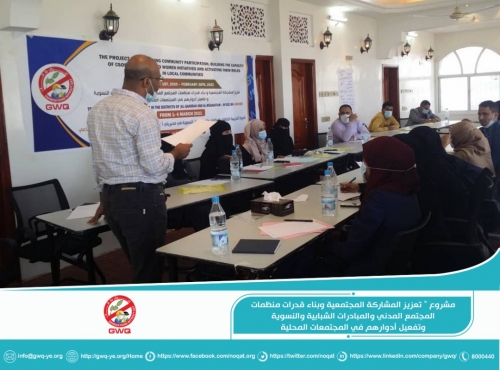 أفتتحت منظمة أجيال بلا قات للتوعية والتنمية، اليوم الاثنين 1 مارس 2021، دورة تدريبية لمنظمات المجتمع المدني والمجموعات النسوية في مديريتي القاهرة والمظفر بمحافظة تعز حول "النوع الاجتماع"، وذلك في إطار مشروع "تعزيز المشاركة المجتمعية وبناء قدرات منظمات المجتمع المدني والمجموعات النسوية والمبادرات الشبابية والنسائية وتفعيل ادوارهم في المجتمع".