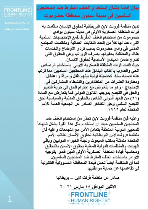 تدين منظمة فرونت لاين البريطانية لحقوق الإنسان ما قامت به قوات المنطقة العسكرية الأولى في مدينة سيئون بوادي حضرموت من إستخدام العنف المفرط لقمع الاحتجاجات السلمية التي دعت لها كلاً من إتحاد النقابات العمالية ومنظمات المجتمع المدني في وادي حضرموت بسبب تردي الأوضاع والخدمات هناك والمطالبة بحقوقهم بصرف الرواتب وهي الحقوق التي تندرج ضمن المبادئ الأساسية لحقوق الإنسان.