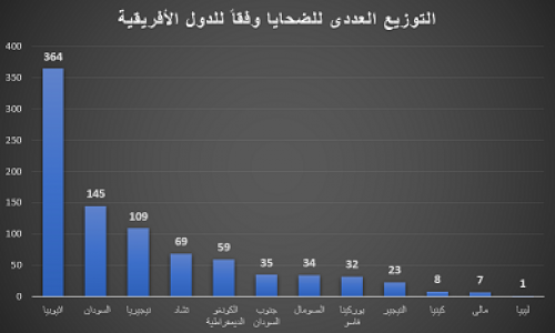 وأورد التقرير أن أكثر الأقاليم تضررًا هو إقليم شرق أفريقيا بواقع 586 ضحية. فيما جاءت إثيوبيا في طليعة الدول الأكثر دموية للشهر الثانى على التوالى، وسقط فيها ما يزيد عن 364 شخصًا، وجاءت دولة نيجيريا كثالث الدول تضرراً فى القارة وأولى الدول في الإقليم الغربي للقارة، وذلك بعد وفاة ما يقرب من 109 شخص بسبب مذابح جماعية من بوكو حرام. وفى السياق ذاته، نجحت تشاد فى التخلص من 340 إرهابيا عقب أحداث العنف التي شهدتها البلاد.