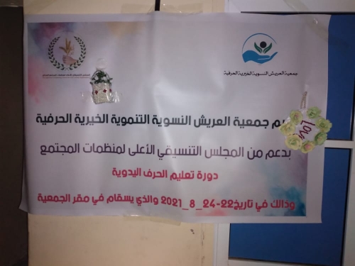 بدعم ورعاية من المجلس التنسيقي الأعلى لمنظمات المجتمع المدني اختتمت صباح اليوم الأربعاء 25 أغسطس 2021م " بالعاصمة عدن "جمعية العريش النسوية التنموية الدورة التدريبية عت صناعة الزخرفة والزينة المنزلية .حيث استمرت الدورة لمدة ثلاث أيام لعدد 25 متدربة من النساء.
