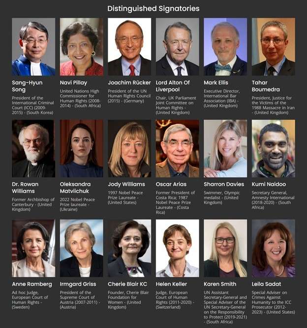 العشرات من القضاة الدوليين السابقين، سفراء، ومدافعين عن حقوق الإنسان.