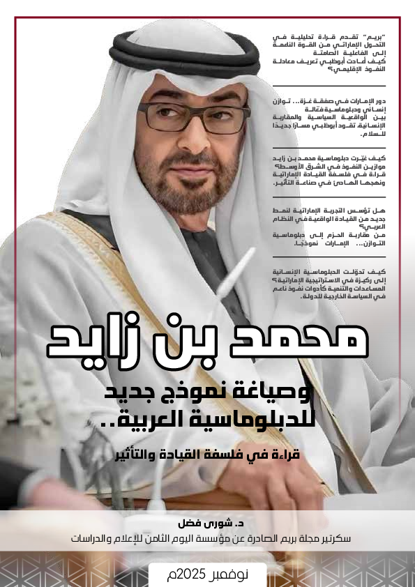 قالت مجلة بريم الصادرة عن مؤسسة اليوم الثامن للإعلام والدراسات، إن دولة الإمارات العربية المتحدة، بقيادة صاحب السمو الشيخ محمد بن زايد آل نهيان، قدّمت خلال العقد الأخير نموذجًا جديدًا للدبلوماسية العربية يقوم على الفاعلية الهادئة، والتوازن بين المصالح الوطنية والانفتاح الدولي، بعيدًا عن الشعارات الأيديولوجية أو المواقف الانفعالية التي طبعت السياسات العربية لعقود طويلة.