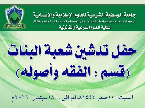 "الوسطية الشرعية" تدشن قسم البنات بكلية العلوم الشرعية والقانونية دشنت جامعة الوسطية الشرعية للعلوم الإسلامية والإنسانية صباح يوم أمس السبت ١١ صفر ١٤٤٣هـ الموافق ١٨ د...