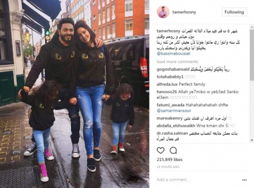 تامر حسني يعايد زوجته وابنتيه بكلمات مؤثرة عايد الفنان المصري تامر حسني، زوجته مصممة الأزياء المغربية بسمة بوسيل وابنتيه. ونشر حسني صورة له ال...