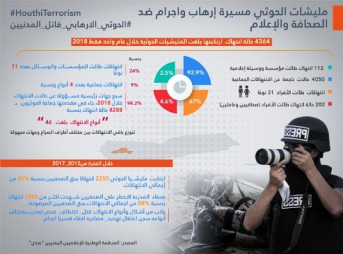 تقرير حقوقي: اليمن أخطر الأماكن بالعالم في ممارسة العمل الصحفي ارتكب الحوثيون خلال سبع سنوات أبشع الجرائم والانتهاكات ضد الصحافة والإعلام في اليمن وشملت الانته...