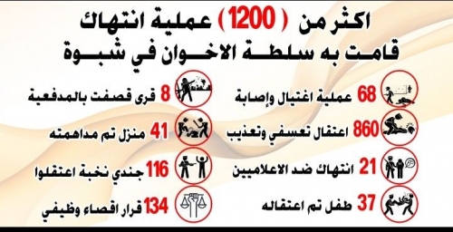 تقرير حقوقي: تنظيم "الاخوان" يرتكبون 1200 عملية انتهاك في شبوة كشف تقرير حقوقي، عن احصائيات كبيرة لانتهاكات حقوق الإنسان من قبل السلطة الإخوانية بمحافظة شبوة. و...