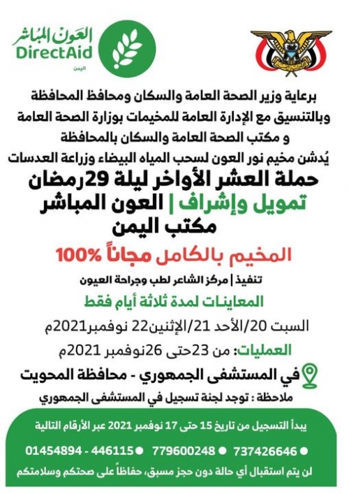 "العون المباشر" تدعو مرضى العيون بالمحويت للمعاينة والعمليات مجاناً دعت العون المباشر مكتب اليمن، مرضى العيون ومن يعانون من المياه البيضاء في محافظة المحويت، إلى ا...
