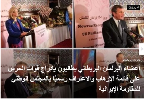 أعضاء البرلمان البريطاني يطالبون إدراج قوات الحرس على قائمة الإرهاب عقد أعضاء البرلمان البريطاني بمعية الجالية الإيرانية المقيمة في المملكة المتحدة مؤتمرًا، عشية عيد ال...