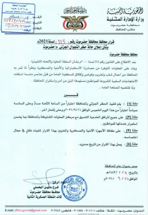 محافظ حضرموت يصدر قرارًا بشأن إعلان حالة حظر التجوال الجزئي أصدر محافظ حضرموت قائد المنطقة العسكرية الثانية اللواء الركن فرج سالمين البحسني، القرار رقم (115...