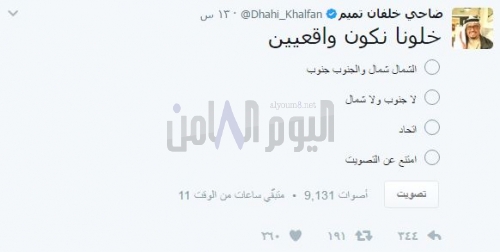 ضاحي خلفان يضع استفتاء حول الشمال والجنوب وضع السياسي الإماراتي وقائد شرطة دبي السابق ضاحي خلفان استفتاء على تويتر حول الشمال والجنوب. وكتب خ...