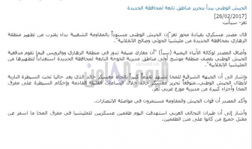 وكالة سبأ تنتقم من القوات الجنوبية بالمخأ نسبت وكالة الأنباء اليمنية سبأ التي تبث من العاصمة السعودية الرياض انتصارات الساحل الغربي إلى قيادة...