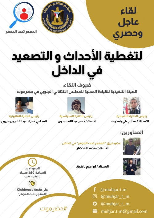 "المهجر تحت المجهر" يعقد لقاء مع بعض قيادات انتقالي حضرموت عقد (نادي المهجر تحت المجهر) مساء الأحد الموافق 1 أغسطس على منصة تطبيق الكلوب هاوس لقاء مع بعض...